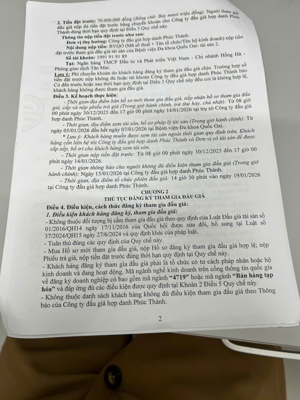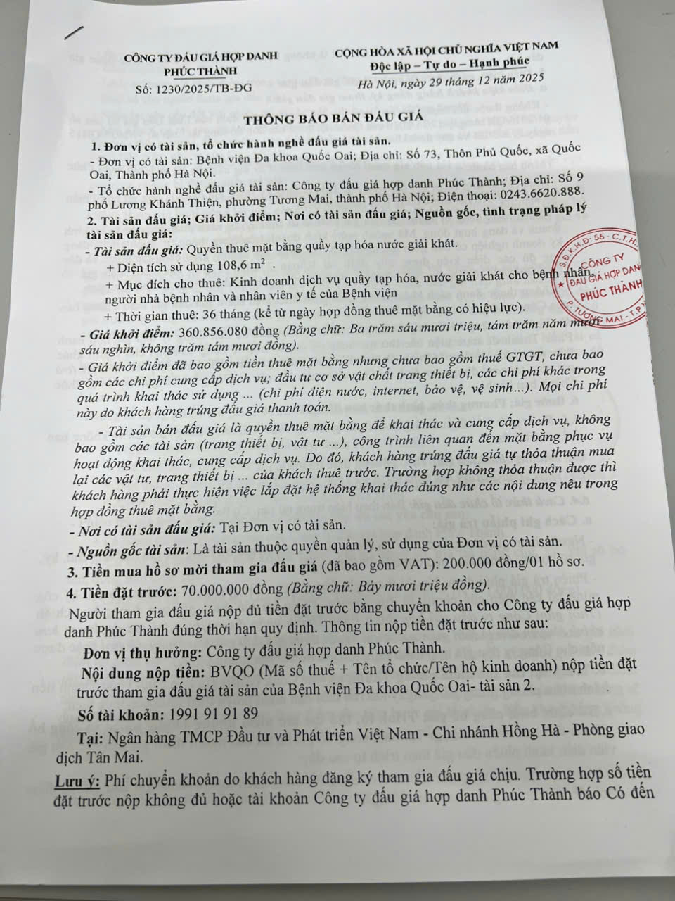 THÔNG BÁO BÁN ĐẤU GIÁ 9 giờ trước Tin tức hoạt động Số:1230/2025/TB-ĐG ngày 29 tháng 12 năm 2025 về việc tài sản đấu giá: Quyền thuê mặt bằng quầy tạp hóa nước giải khát. 2025-12-31 BV Quản trị Share Facebook Twitter Google +
