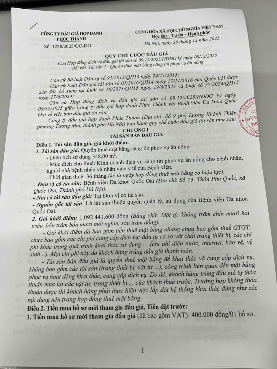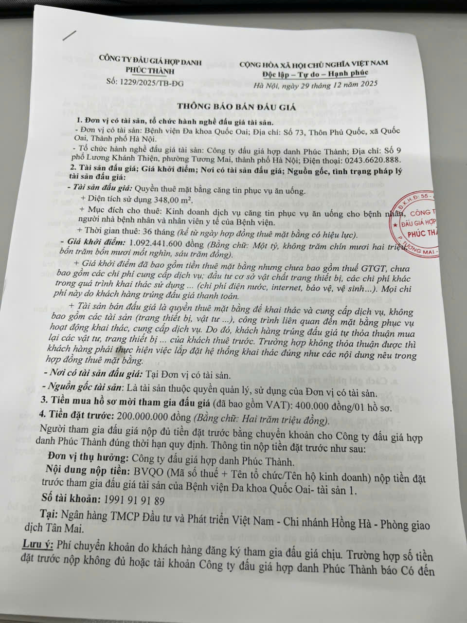 THÔNG BÁO BÁN ĐẤU GIÁ 10 giờ trước Tin tức hoạt động Số:1229/2025/TB-ĐG ngày 29 tháng 12 năm 2025 về việc tài sản đấu giá: Quyền thuê mặt bằng căng tin phục vụ ăn uống. 2025-12-31 BV Quản trị Share Facebook Twitter Google +