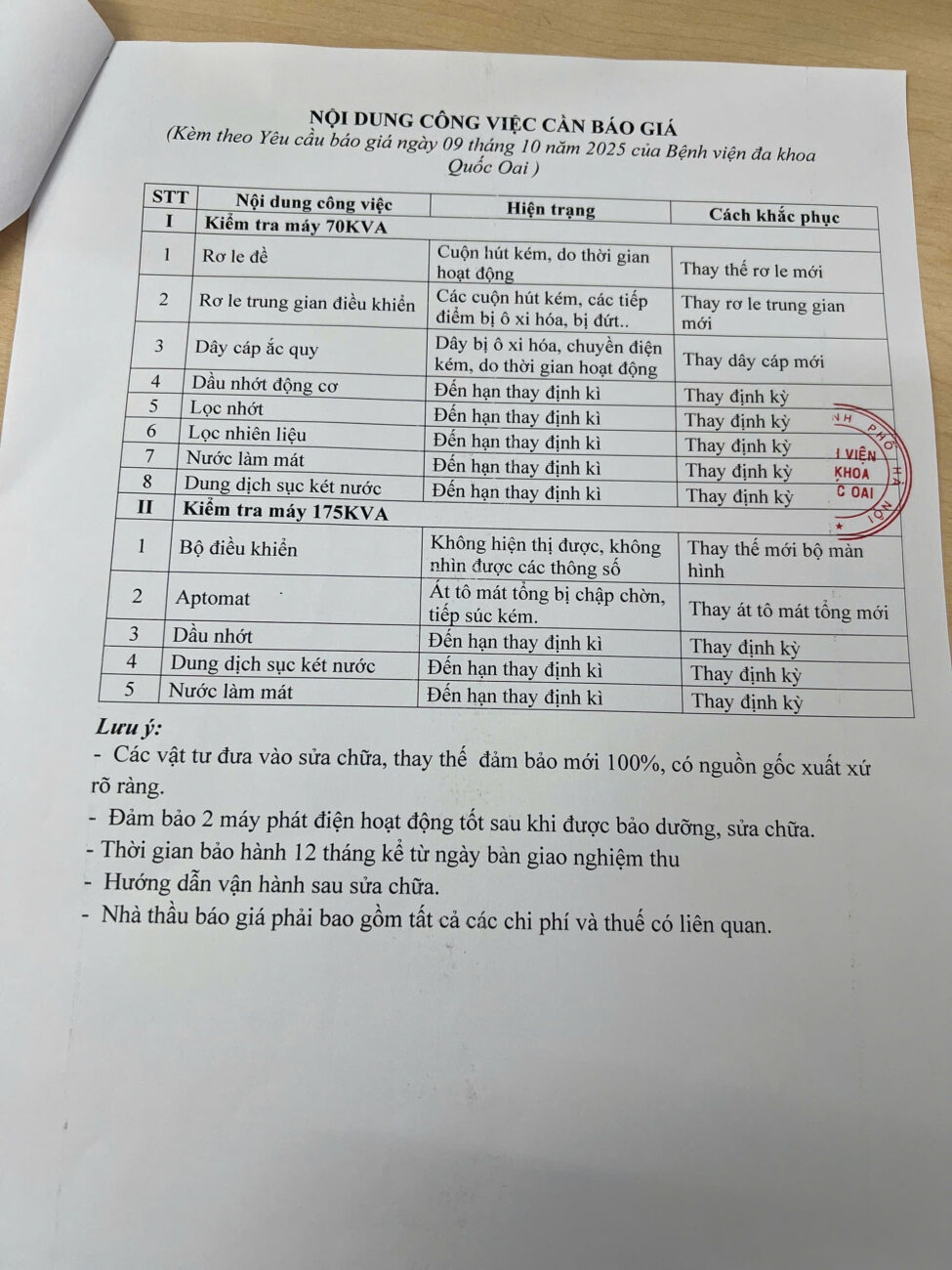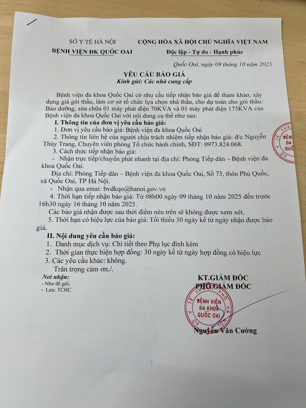 Bệnh viện đa khoa Quốc Oai có nhu cầu tiếp nhận báo giá để tham khảo, xây dựng giá gói thầu làm cơ sở tổ chức lựa chọn nhà thầu cho dự toán cho gói thầu: Bảo dưỡng, sửa chữa 01 máy phát điện 70KVA và 01 máy phát điện 175KVA của Bệnh viện đa khoa Quốc Oai.