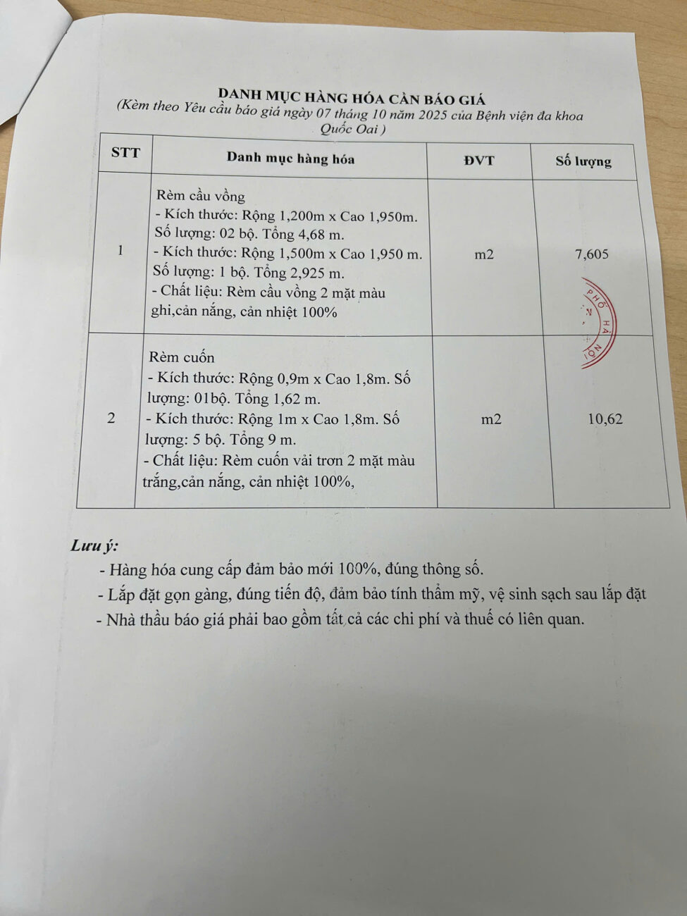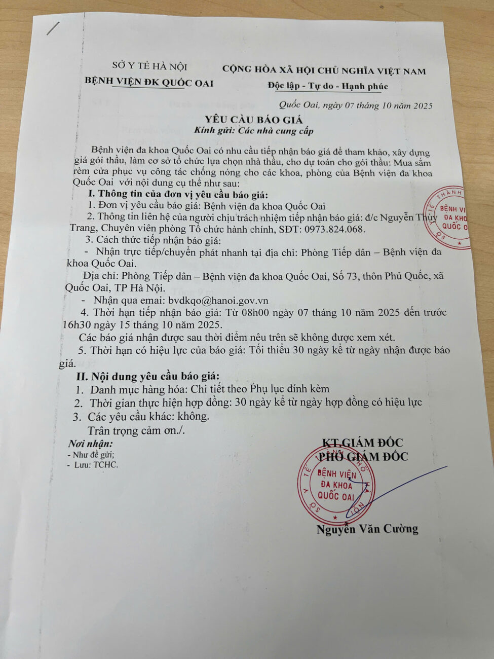 Bệnh viện đa khoa Quốc Oai có nhu cầu tiếp nhận báo giá để tham khảo, xây dựng giá gói thầu làm cơ sở tổ chức lựa chọn nhà thầu cho dự toán cho gói thầu: Mua sắm rèm cửa phục vụ công tác chống nóng cho các khoa, phòng của Bệnh viện đa khoa Quốc Oai.
