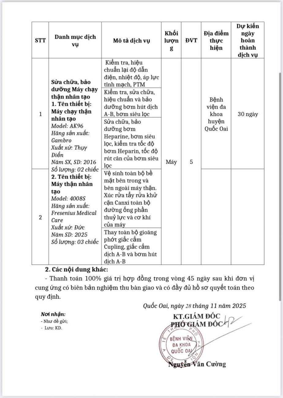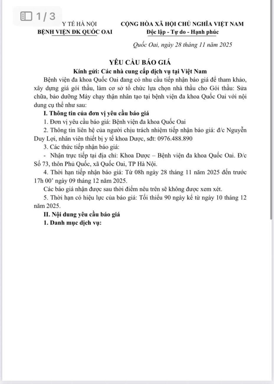 Bệnh viện đa khoa Quốc Oai đang có nhu cầu tiếp nhận báo giá để tham khảo, xây dựng giá gói thầu, làm cơ sở tổ chức lựa chọn nhà thầu cho Gói thầu: Sửa chữa, bảo dưỡng Máy chạy thận nhân tạo tại bệnh viện đa khoa Quốc Oai với nội dung cụ thể theo văn bản đính kèm