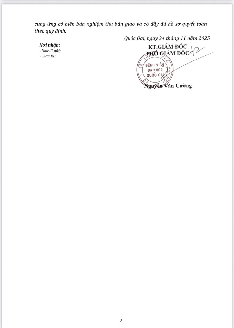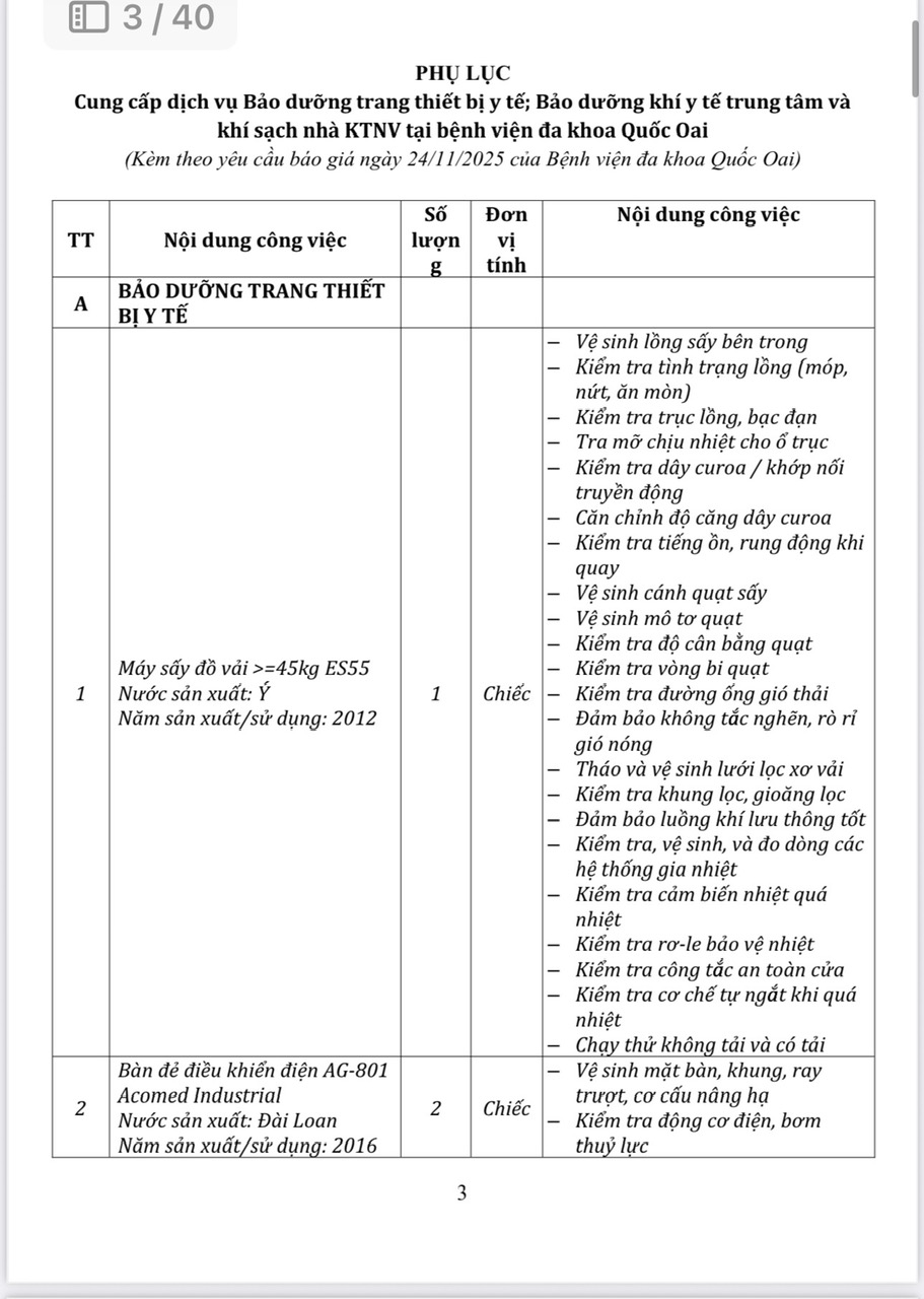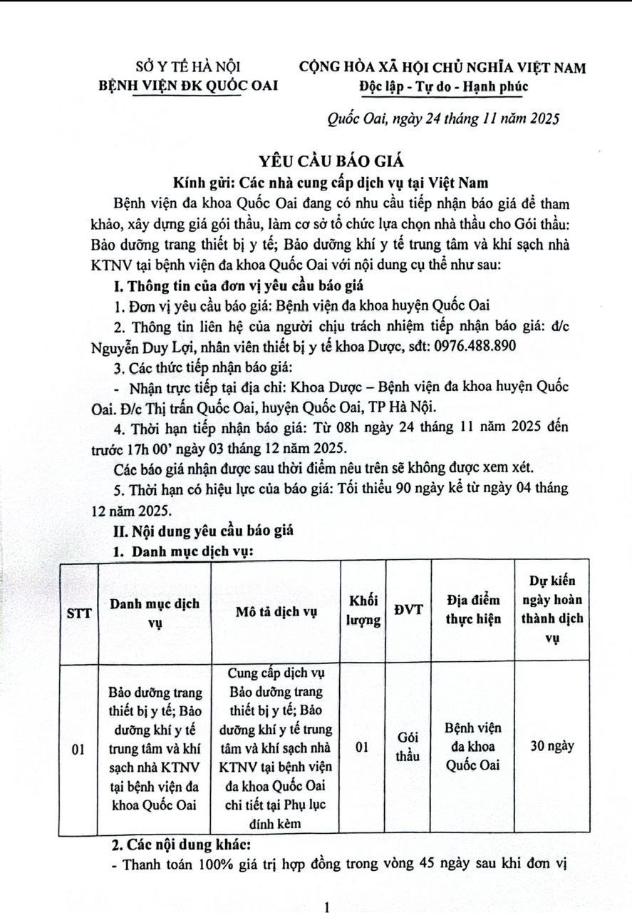 Bệnh viện đa khoa Quốc Oai đang có nhu cầu tiếp nhận báo giá để tham khảo, xây dựng giá gói thầu, làm cơ sở tổ chức lựa chọn nhà thầu cho Gói thầu: Bảo dưỡng trang thiết bị y tế; Bảo dưỡng khí y tế trung tâm và khí sạch nhà KTNV tại bệnh viện đa khoa Quốc Oai chi tiết theo văn bản đính kèm.