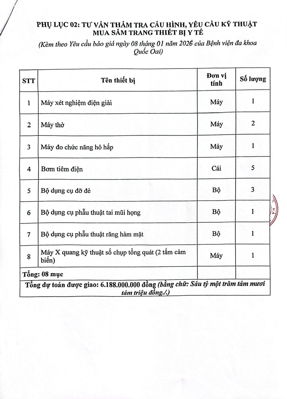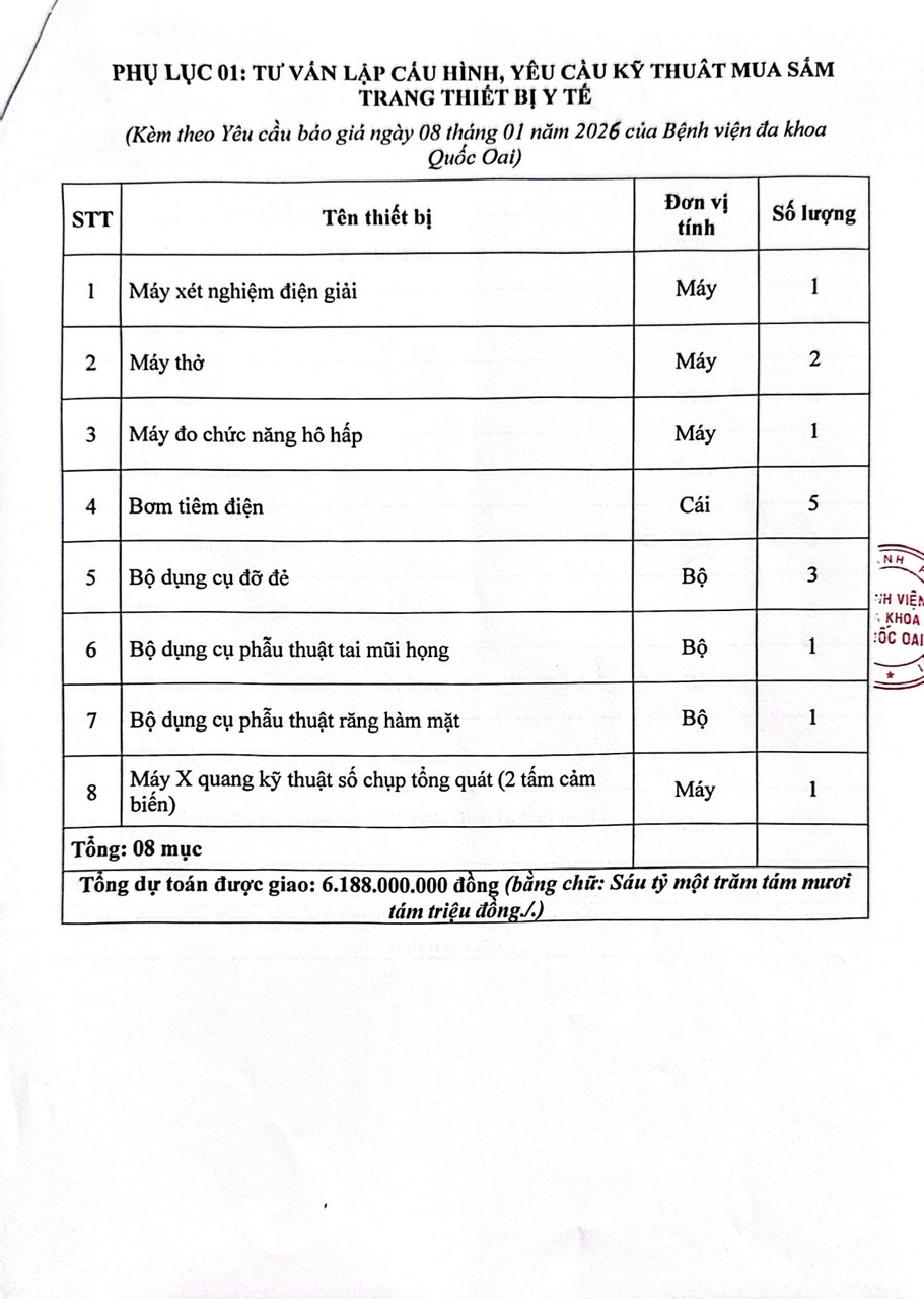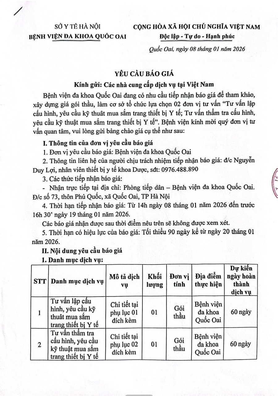 Bệnh viện đa khoa Quốc Oai đang có nhu cầu tiếp nhận báo giá để tham khảo, xây dựng giá gói thầu, làm cơ sở tổ chức lựa chọn 02 đơn vị tư vấn “Tư vấn lập cấu hình, yêu cầu kỹ thuât mua sắm trang thiết bị Y tế; Tư vấn thẩm tra cấu hình, yêu cầu kỹ thuật mua sắm trang thiết bị Y tế”. Bệnh viện kính mời quý đơn vị tư vấn quan tâm, vui lòng gửi bảng chào giá theo yêu cầu chi tiết tại văn bản đính kèm.