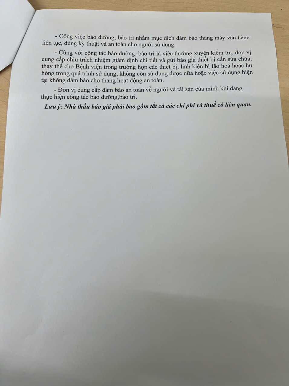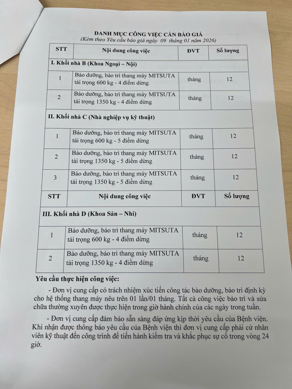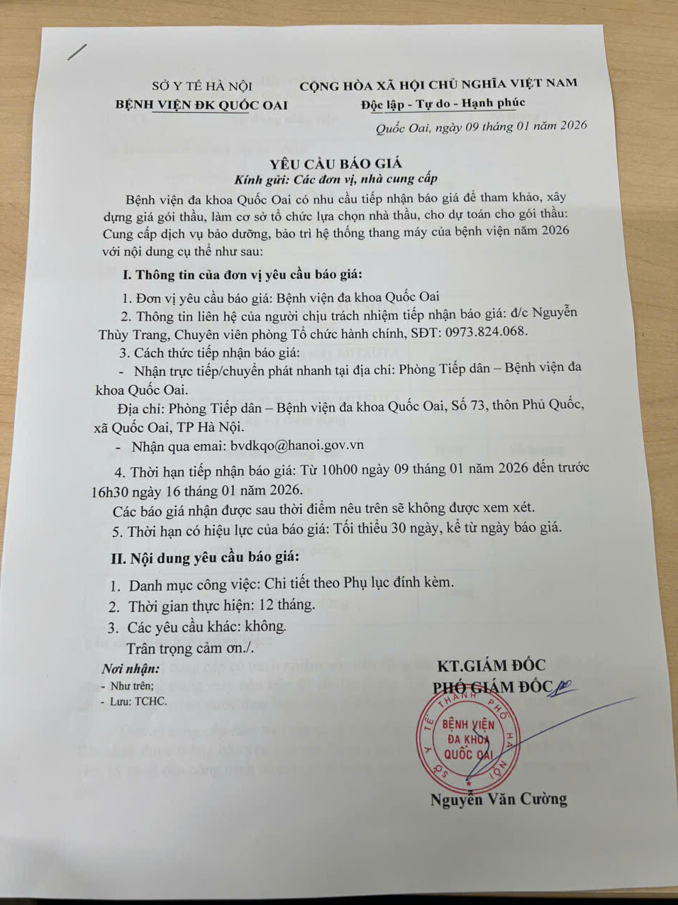 Bệnh viện đa khoa Quốc Oai có nhu cầu tiếp nhận báo giá để tham khảo, xây dựng giá gói thầu làm cơ sở tổ chức lựa chọn nhà thầu cho dự toán cho gói thầu: Cung cấp dịch vụ bảo dưỡng, bảo trì hệ thống thang máy của bệnh viện năm 2026