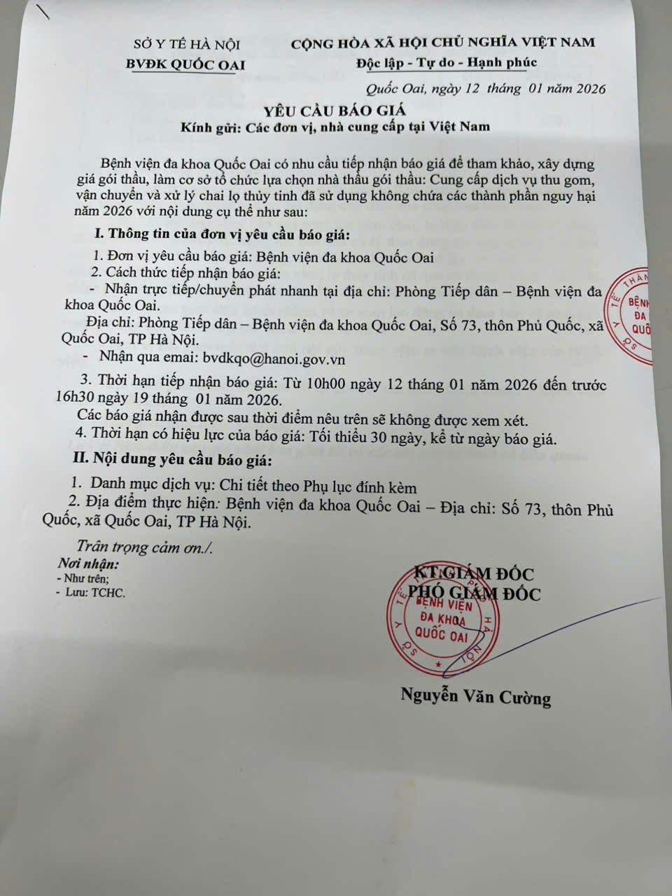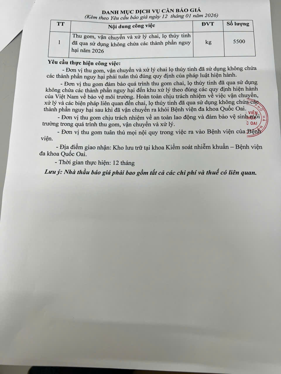 Bệnh viện đa khoa Quốc Oai có nhu cầu tiếp nhận báo giá để tham khảo, xây dựng giá gói thầu, làm cơ sở tổ chức lựa chọn nhà thầu gói thầu: Cung cấp dịch vụ thu gom, vận chuyển và xử lý chai lọ thủy tinh đã sử dụng không chứa các thành phần nguy hại năm 2026 với nội dung cụ thể như sau: