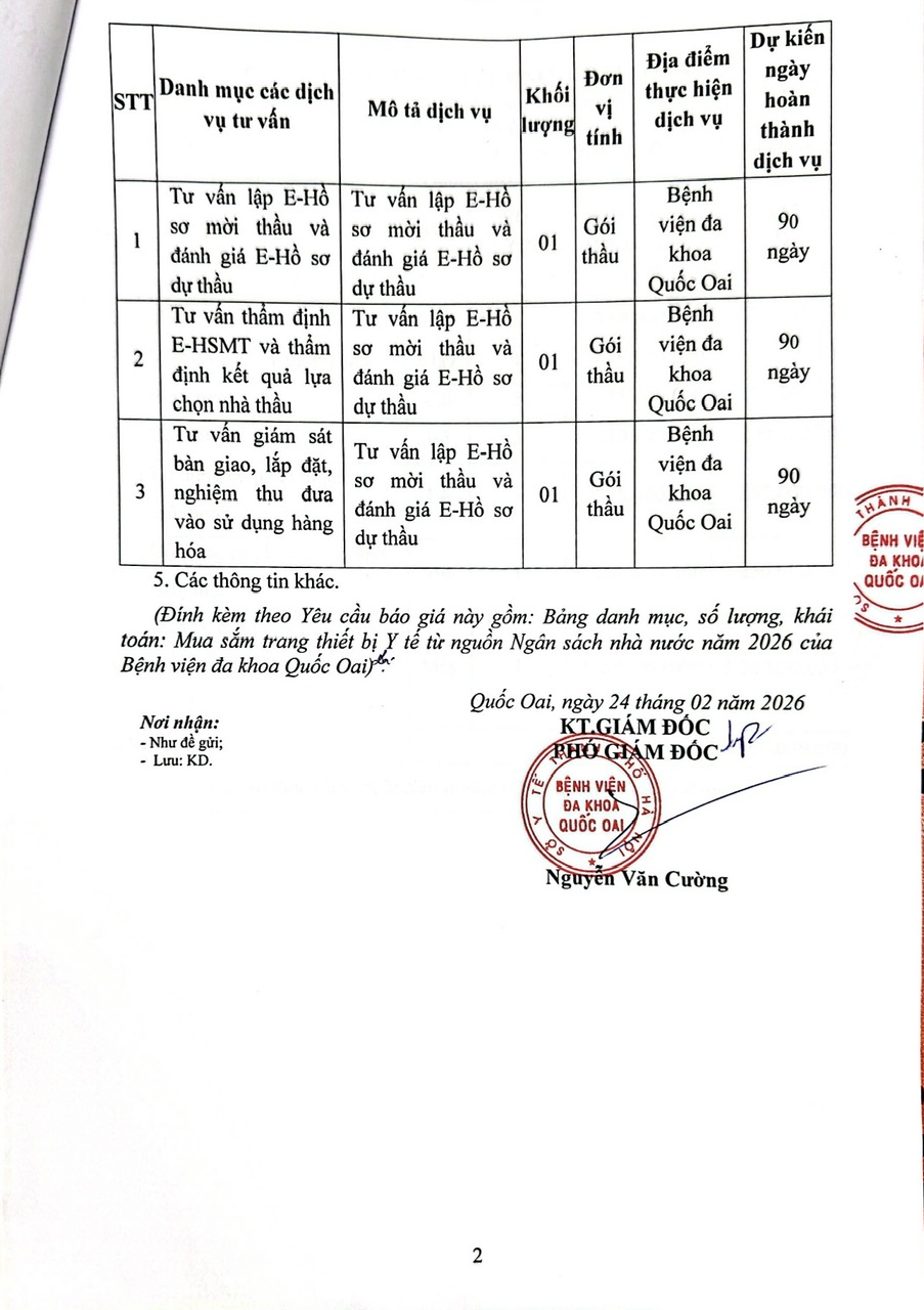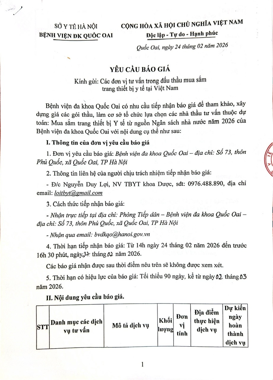 Bệnh viện đa khoa Quốc Oai có nhu cầu tiếp nhận báo giá để tham khảo, xây dựng giá các gói thầu, làm cơ sở tổ chức lựa chọn các nhà thầu tư vấn thuộc dự toán: Mua sắm trang thiết bị Y tế từ nguồn Ngân sách nhà nước năm 2026 của Bệnh viện đa khoa Quốc Oai với nội dung cụ thể theo văn bản đính kèm.