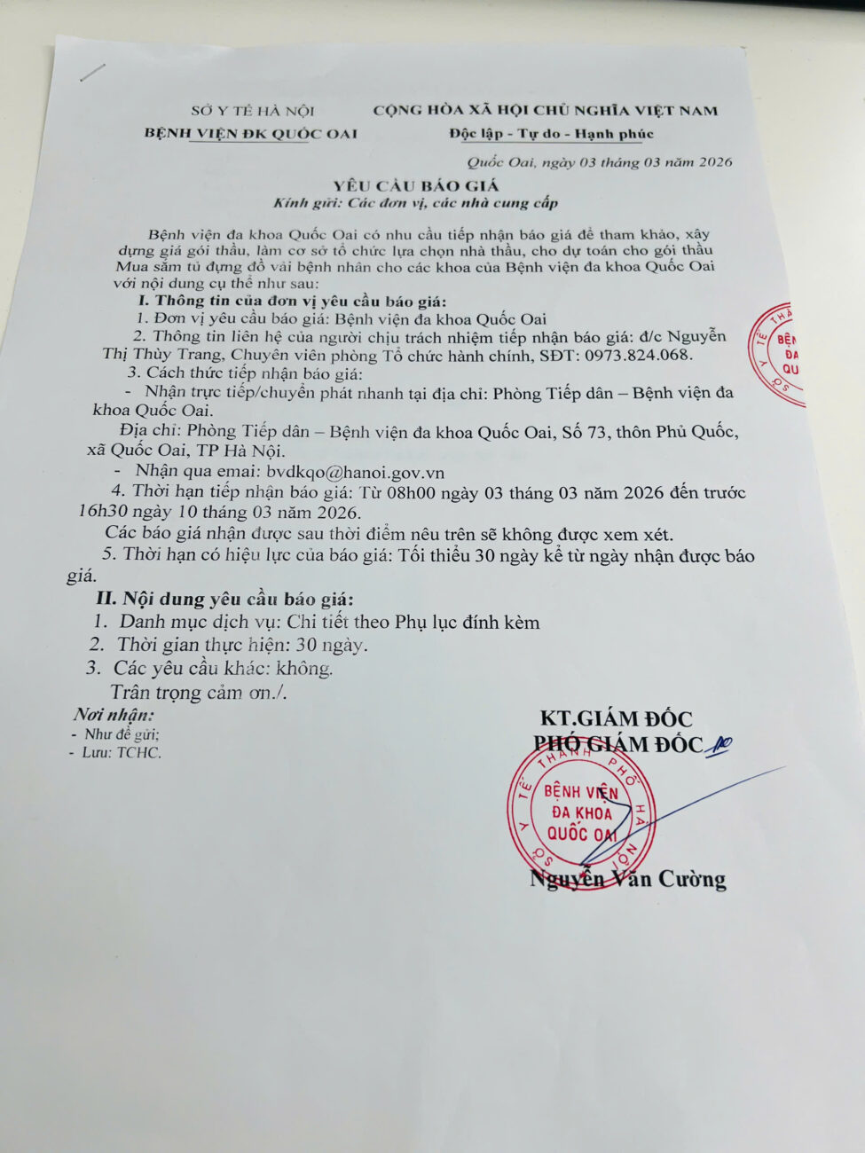 Bệnh viện đa khoa Quốc Oai có nhu cầu tiếp nhận báo giá để tham khảo, xây dựng giá gói thầu làm cơ sở tổ chức lựa chọn nhà thầu cho dự toán cho gói thầu: Mua sắm tủ đựng đồ vải bệnh nhân cho các khoa của Bệnh viện đa khoa Quốc Oai.