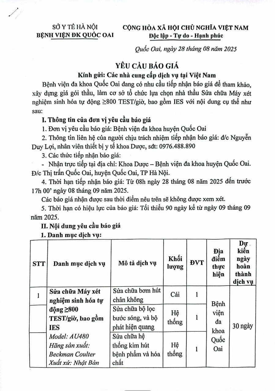 Bệnh viện đa khoa Quốc Oai đang có nhu cầu tiếp nhận báo giá để tham khảo, xây dựng giá gói thầu, làm cơ sở tổ chức lựa chọn nhà thầu Sửa chữa Máy xét nghiệm sinh hóa tự động ≥800 TEST/giờ, bao gồm IES với nội dung cụ thể theo văn bản đính kèm.