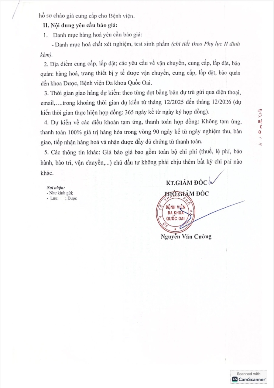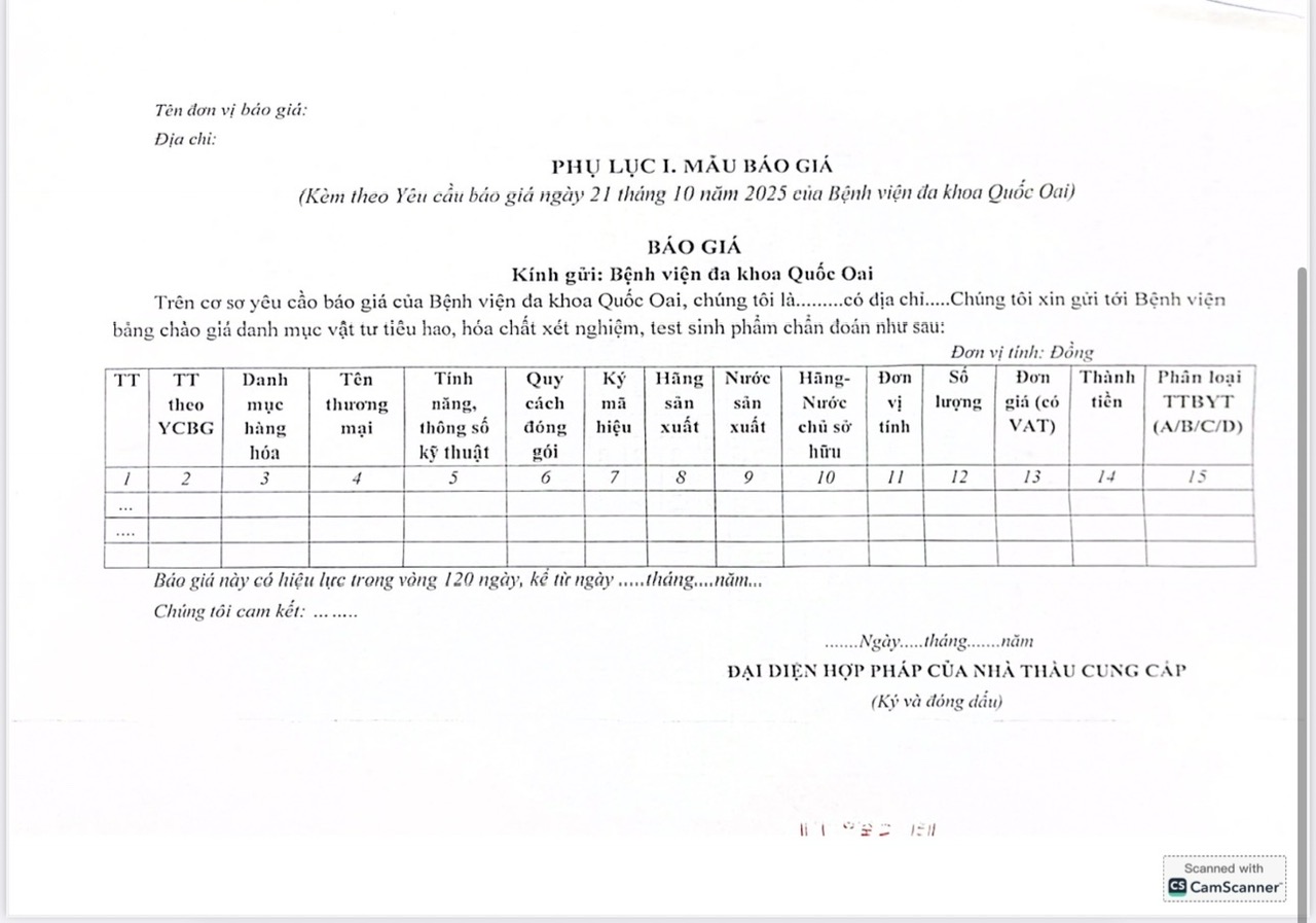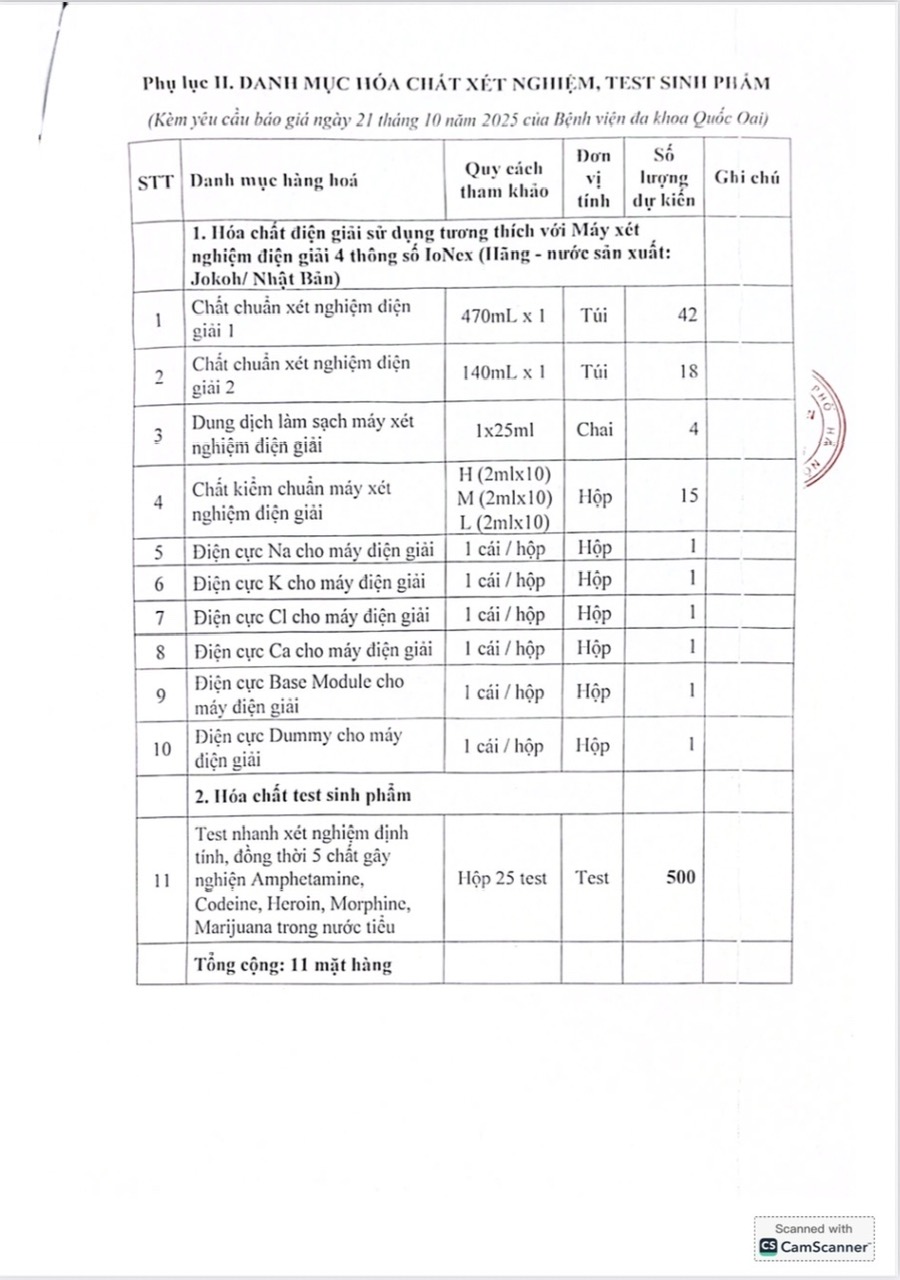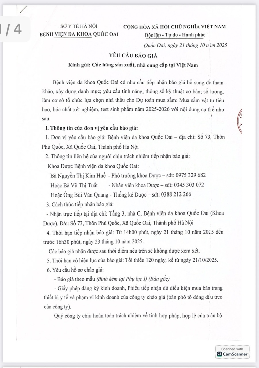 Bệnh viện đa khoa Quốc Oai có nhu cầu tiếp nhận báo giá bổ sung để tham khảo, xây dựng danh mục; yêu cầu tính năng, thông số kỹ thuật cơ bản; số lượng, làm cơ sở tổ chức lựa chọn nhà thầu cho Dự toán mua sắm: Mua sắm vật tư tiêu hao, hóa chất xét nghiệm, test sinh phẩm năm 2025-2026 với nội dung cụ thể như theo văn bản đính kèm: