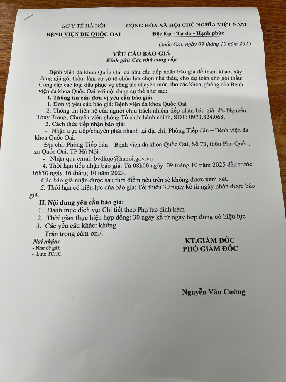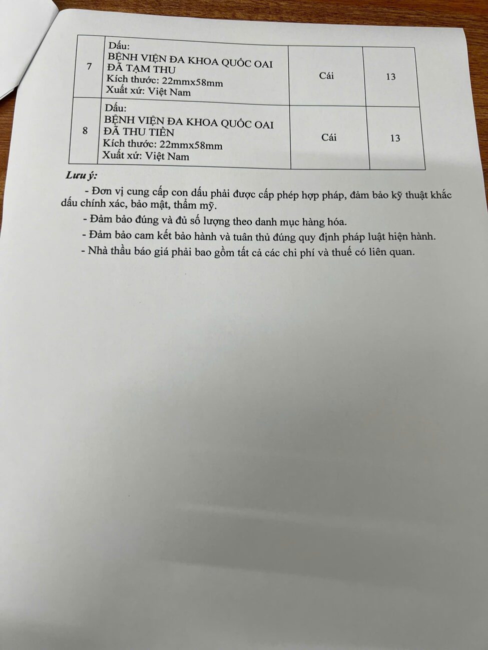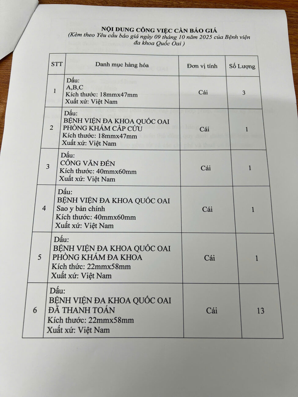 Bệnh viện đa khoa Quốc Oai có nhu cầu tiếp nhận báo giá để tham khảo, xây dựng giá gói thầu làm cơ sở tổ chức lựa chọn nhà thầu cho dự toán cho gói thầu: Cung cấp các loại dấu phục vụ công tác chuyên môn cho các khoa, phòng của Bệnh viện đa khoa Quốc Oai.